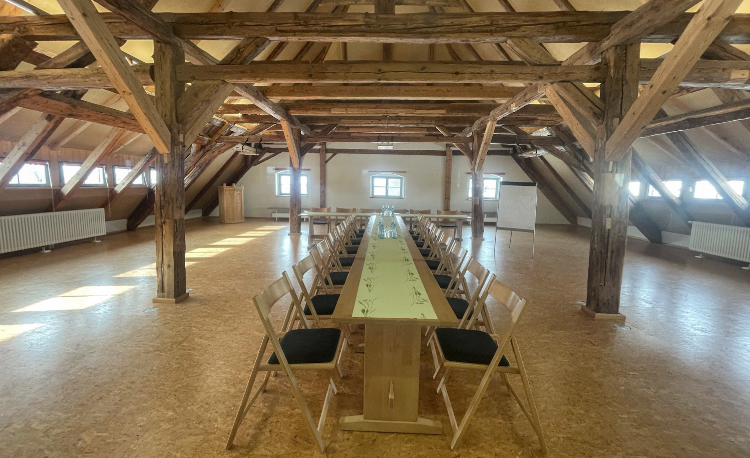In der „Alten Schmiede” am Schloss Krobnitz ist im Dachgeschoss ein Tagungsraum für ca. 70 Personen mietbar. Auch Firmenpräsentationen und Messen sprechen Kunden in diesem außergewöhnlichen Ambiente besonders an. Moderne Kommunikations-Möglichkeiten stehen Ihnen selbstverständlich zu Verfügung. Zur Pausenversorgung kann ein qualitätvolles Catering über die Geschäftsstelle gebucht werden.